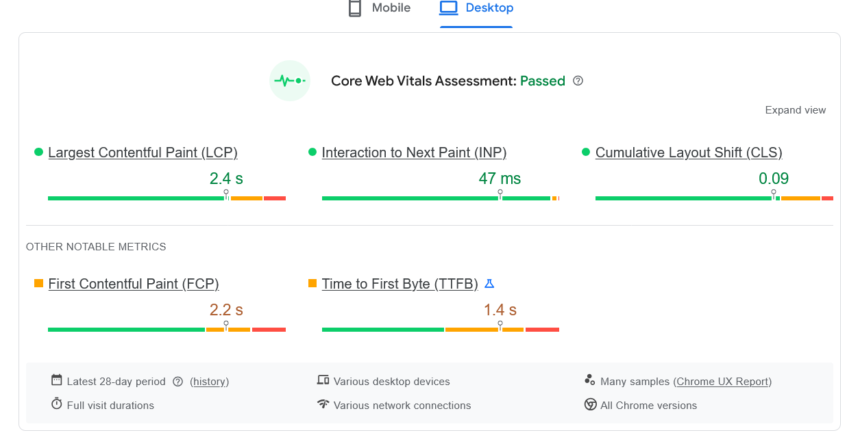 - Chrome User Experience Report: CrUX shows real-user data, showing how visitors on different devices and networks experience your website.