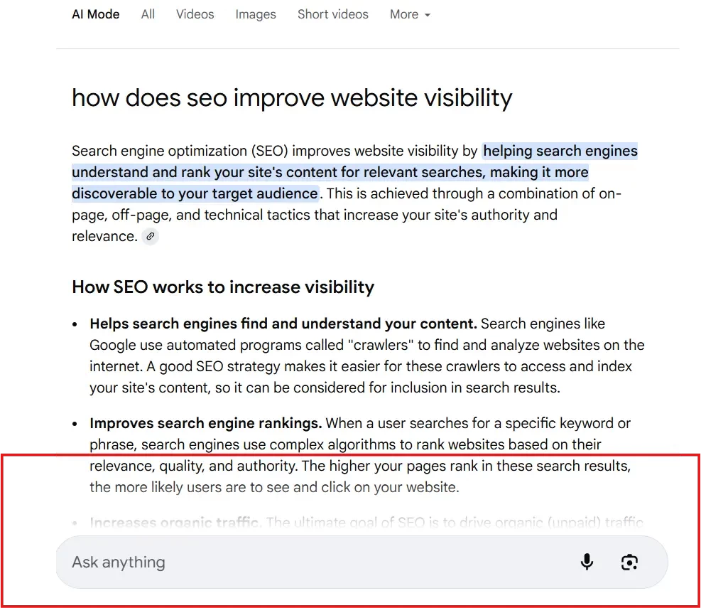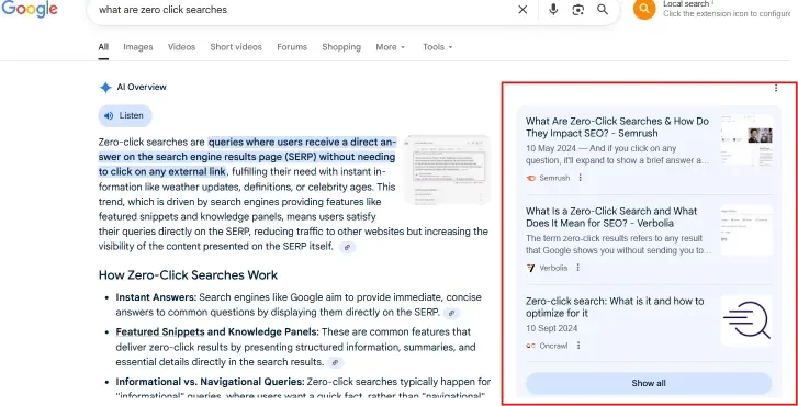 Zero-click searches are when users directly receive the answer or results for their queries and questions directly at the top of the search engine result page without needing to visit any website or do any additional navigation. The information appeared on top of the page in the form of snippets, knowledge panels, and other sections. Initially, zero-click searches comprised information for simple queries such as mathematical calculations, time conversions, date and time, or word definitions. As the next step, search engines expanded into richer formats capable of handling complex queries and providing the appropriate information simply and concisely. The latest additions, AI mode and AI overview, provide advanced results by analyzing multiple available sources to generate conversational answers. AI-powered results allow users to do all sorts of complex actions without having to leave the initial SERP!