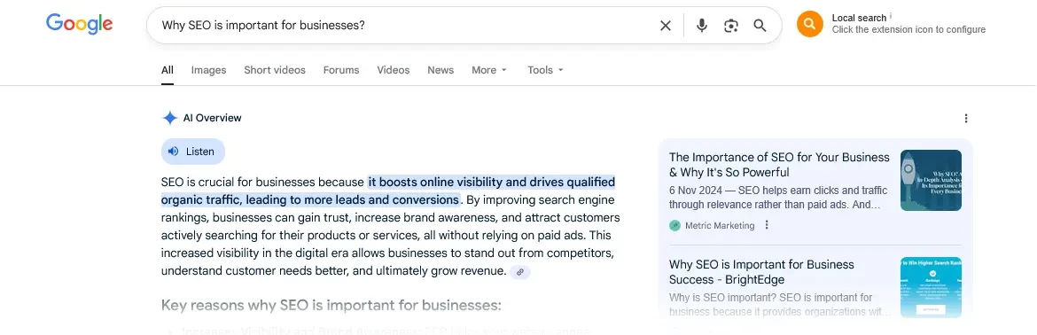 Zero-click searches impact websites in two major ways. On the negative side, zero-click searches significantly reduce website traffic, as users no longer find it necessary to visit websites because they receive all the information at a glance on the SERP. On the other hand, zero-click searches provide brands with opportunities to remain visible and become featured through the AI overview or information snippets, which leads to boosting brand awareness and building credibility. Here are some other key impacts of zero-click searches on SEO: